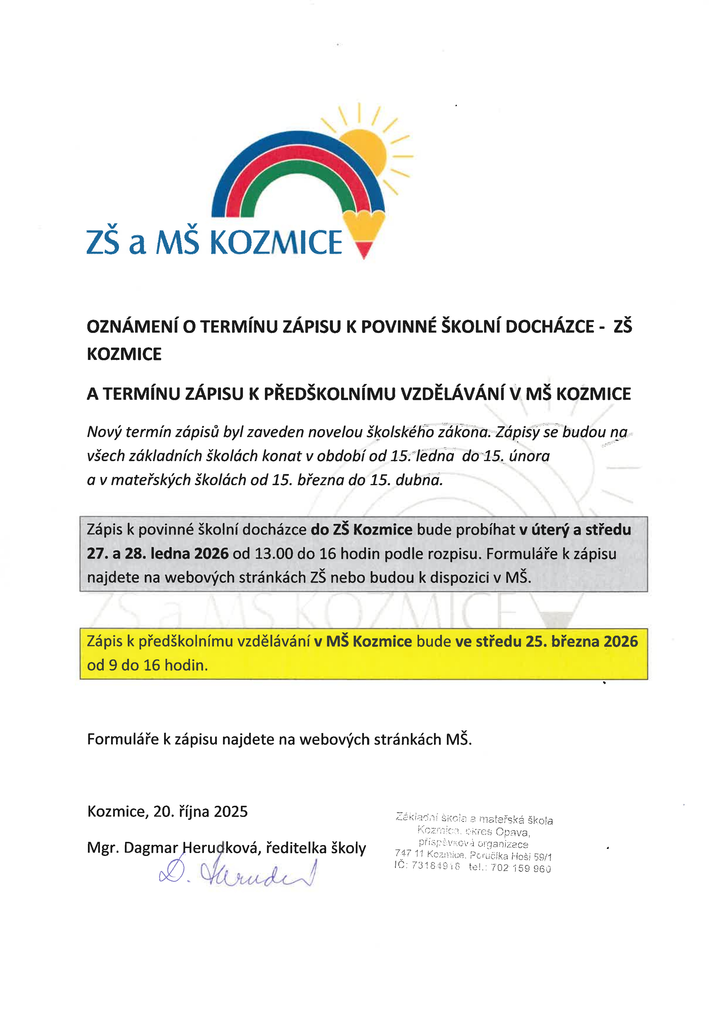 Oznámení o termínu zápisu k povinné školní docházce
